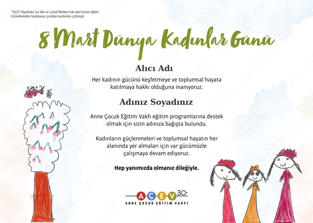 8 Mart Dünya Kadınlar Günü’nü AÇEV'le özel kılın. İsme özel sertifikalarımızdan alın, bağışınız kadınlar için yürüttüğümüz çalışmalarımıza katkı sağlasın.