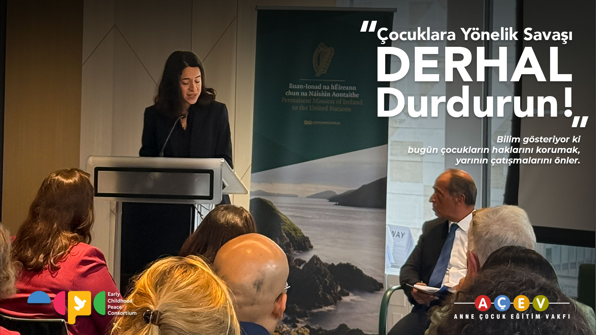 Anne Çocuk Eğitim Vakfı (AÇEV) olarak Birleşmiş Milletler 80. Genel Kurulu kapsamında, kurucularından olduğumuz Erken Çocukluk Barış Konsorsiyumu (ECPC) tarafından İrlanda Birleşmiş Milletler (BM) Daimi Temsilciliği ortaklığında 25 Eylül 2025 tarihinde gerçekleşen “Çocuklara Yönelik Savaşı...