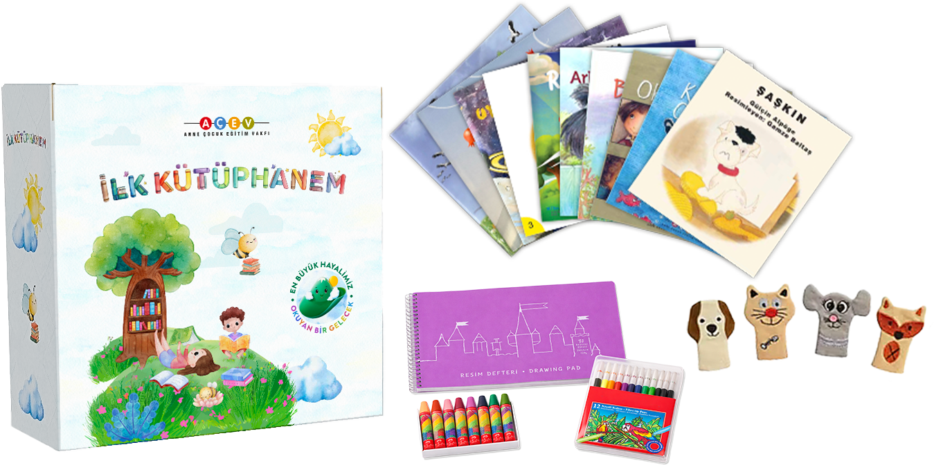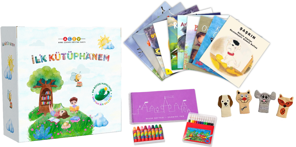Bağışlarınızla, ihtiyaç sahibi çocuklara ulaştıracağımız İlk Kütüphanem Seti’nin içinde 10 adet hikaye kitabı, her bir kitap için ebeveynlere yönelik rehber, boya kalemi, pastel boya, resim defteri ve parmak kukla yer alıyor.